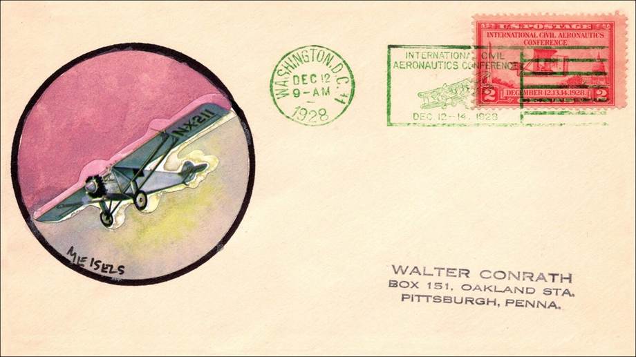 First Day Cover with 5-cent stamp. Hand-drawn and hand-painted cachet by Herbert Meisels. The cachet shows the Spirit of St. Louis registered NX211, that was flown by Charles Lindbergh on 20-21 May 1927, on the first solo nonstop transatlantic flight from Long Island, New York, to Paris, France, for which Lindbergh won the $25,000 Orteig Prize. The Orteig Prize was a reward offered to the first Allied aviator(s) to fly non-stop from New York City to Paris or vice versa. Herbert Meisels (1925-2016) and Henry Otto Meisel (1900-1966) are different Cachet makers, but are not related. Henry Otto Meisel was also a dealer of "Indian" motorcycles.