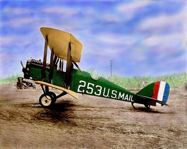 First Day Cover with 2-cent stamp by Herbert Meisels. Picture of 1920 De Havilland DH-4B biplane (see colour picture). The Aircraft Manufacturing Company (Airco, de Havilland) DH.4 was a British two-seat biplane day bomber of the First World War. It was designed by Geoffrey de Havilland (hence "DH") for Airco, and was the first British two-seat light day bomber to have an effective defensive armament. The DH-4 performed its first flight in August 1916; less than a year later, it entered operational service in France on 6 March 1917. The majority of DH-4s were actually manufactured as general-purpose two-seaters in the United States, the majority of which were intended to be used in service with the American expeditionary forces being deployed to fight in France. Named the "Liberty Plane" (due to its Liberty Engine), the DH-4 was chosen by the United States Army for its simplicity and potential for mass production. Cooperation between the US Army and the Post Office Department was essential during the infancy of the Airmail Service; the Post Office Department not only bought planes built by the Army, it also employed Army fighter pilots to run the first airmail routes and test out new planes. The Postal Service acquired 100 of them from the army in 1918, and retrofitted them to make them safer, denominating them as the DH-4B. In 1919, the DH-4B was standardized by the US Post Office, being modified to be flown from the rear cockpit with a 400 lb (180 kg) watertight mail compartment replacing the forward cockpit. By 1921, pilots were assigned an individual plane on the DH-4B, hence the 253 number seen on the plane. On 21 August 1924, a transcontinental night and day route between San Francisco and New York was established on an experimental basis, involving night flight and using light beacons to guide open-cockpit planes at night. The DH-4B continued in Post Office service until August 1927, when the last airmail routes were passed to private contractors.