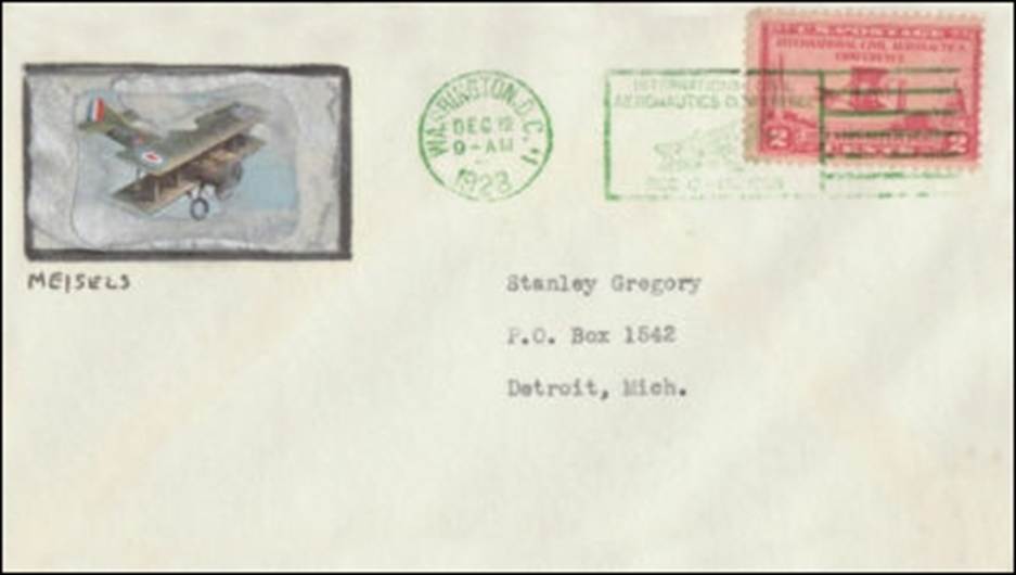 Cover with 5-cent stamp. Hand-drawn and hand-painted cachet by Herbert Meisels. Wright Brothers Flyer I.