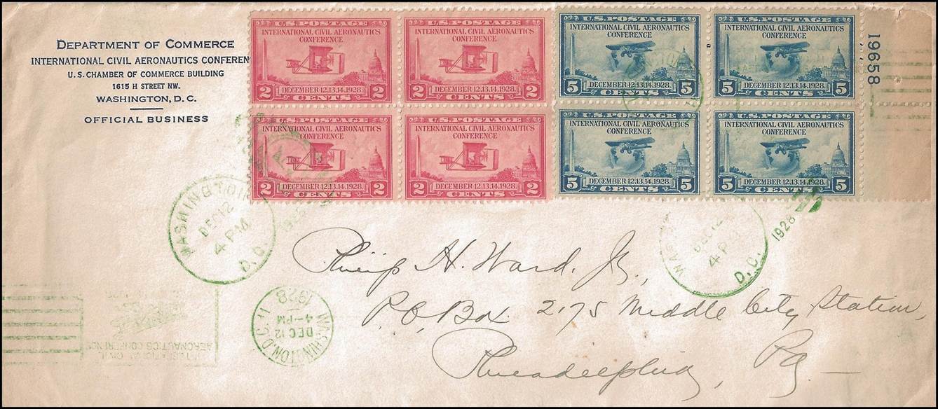 First Day Cover on the stationery specially prepared by the Department of Commerce for this Conference, which was held in the U.S. Chamber of Commerce Building. Two blocks of four stamps, one with the marginal inscription.