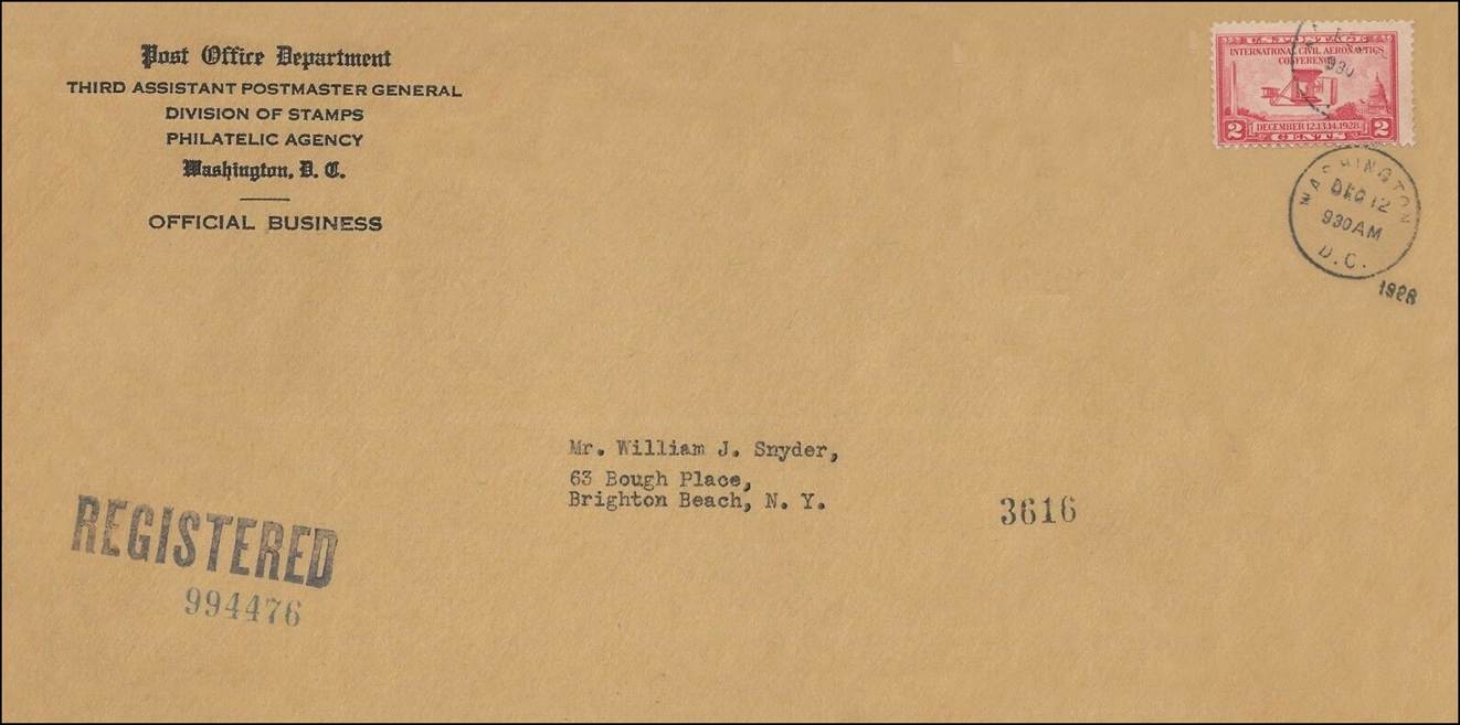 Registered cover on stationery from the Post Office Department (Division of stamps). Postmark at Washington on 12 December 1928.