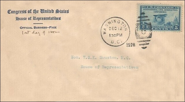 Last Day Cover (12 December 1928) sent from the House of Representatives to the Delegate in Congress from Hawaii V.S.K. Houston. Hawaii was then a possession.