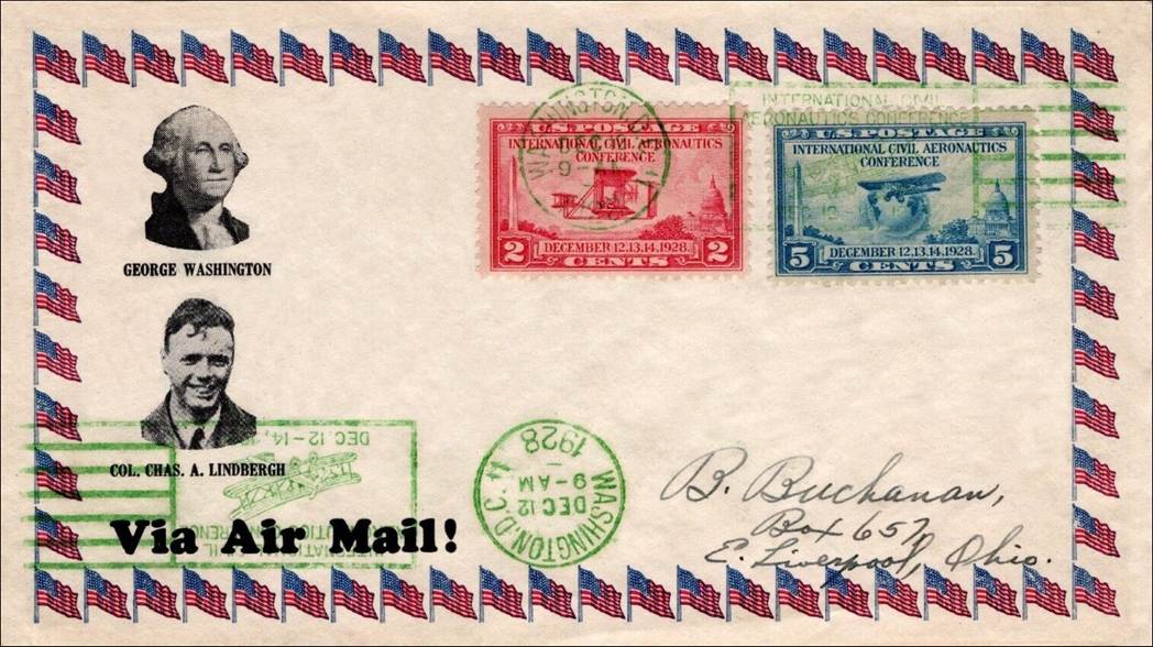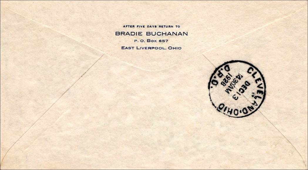 Last Day of Issue (14 December 1928). The lower cover shows the 5-cent stamp with VIA AIRMAIL added. Bradie Buchanan Cachet (in red and blue, with Lindbergh’s Spirit of St. Louis). Best known for generic or general-purpose cachets, Bradie Buchanan produced FDC Cachets in East Liverpool, OH from 1927 to 1960.