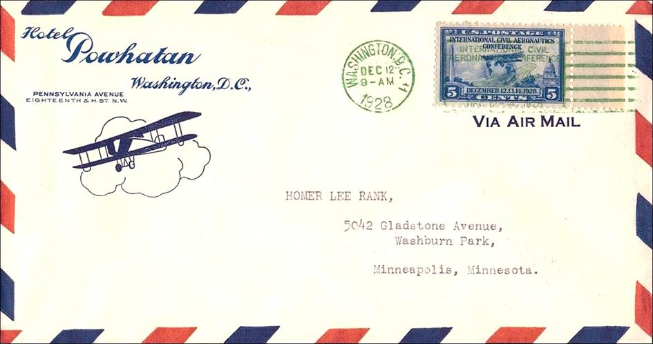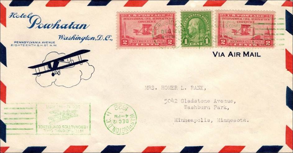 First Day Cover sent from the Powhatan Hotel located on Pennsylvania Avenue in Washington.The Powhatan Hotel, built in 1911, was an interesting example of early 19th century hotel architecture. The building's roof garden was a popular dining and dancing spot for many years. Notice the particular silhouette of the aircraft at the left side.