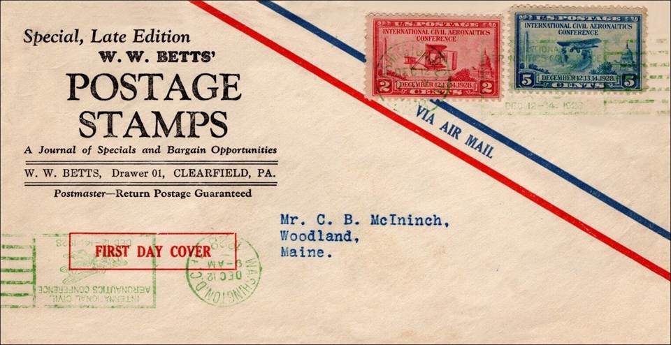 Historic postal cover with 1928 combo stamp. First Day Cover on stationery of W.W. Betts, Stamp Dealer in Clearfield.