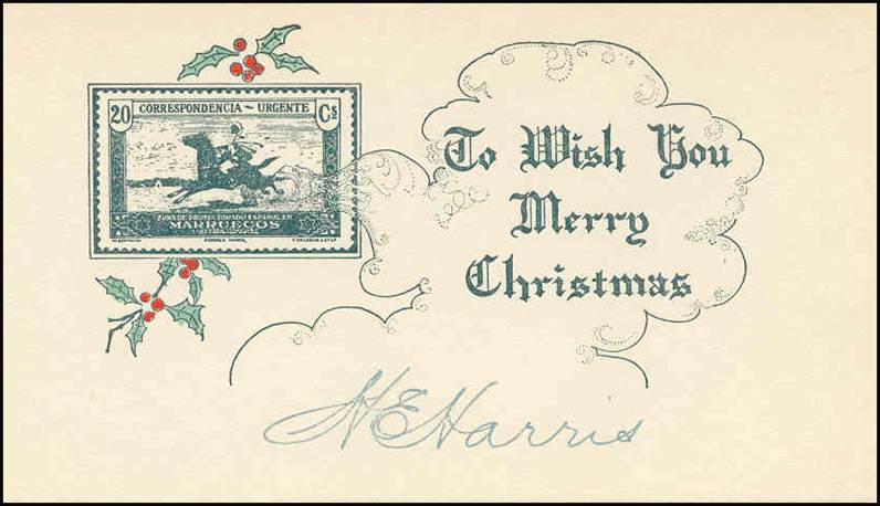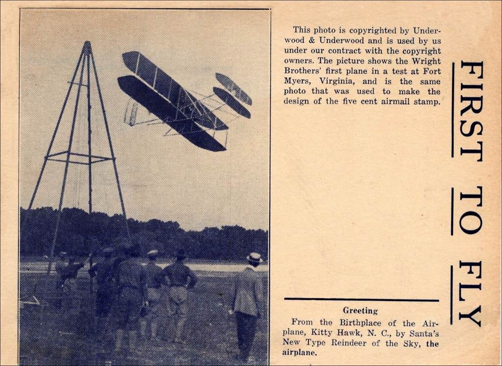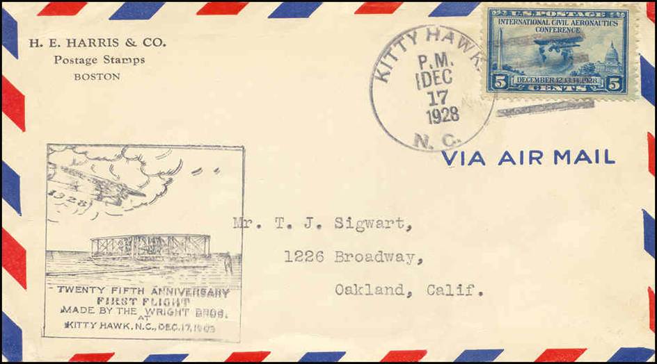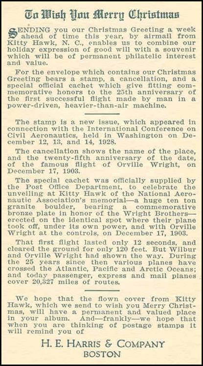 Cover postmarked in Kitty Hawk, N.C., on 17 December 1928 for the Wright Brothers 25th anniversary first flight celebration. Cachet says "Twenty-fifth anniversary first flight made by the Wright Brothers at Kitty Hawk, N.C., Dec. 17, 1903”. It was a gift sent to stamp collectors from long-time dealer H. E. Harris & Co., Boston, Mass.; it includes two enclosures (see here below), providing an interesting example of a combo Christmas, special event and advertising cover.