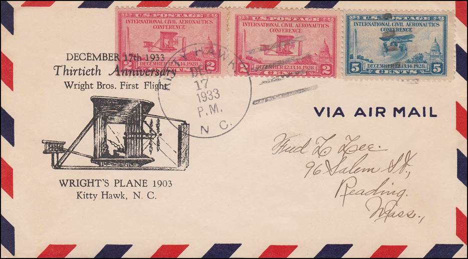 First Day Cover with cancel on 17 December 1933, commemorating the 30th anniversary of the Wright’s feat. Picture showing Wright’s Flyer I.