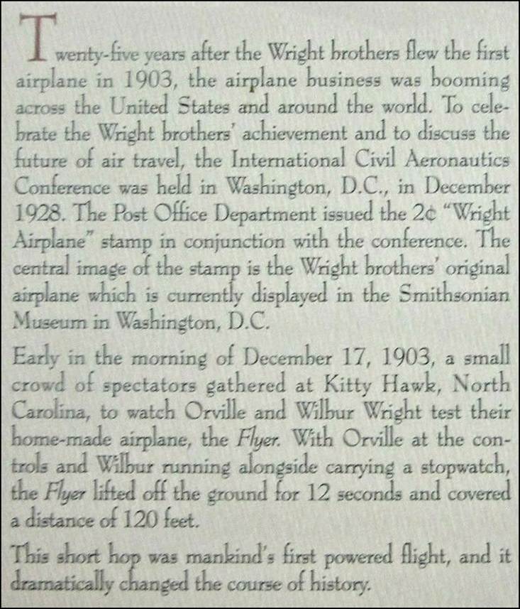 Historical description card of the first powered flight with the 2-cent stamp - Size: 10" x 6.5".