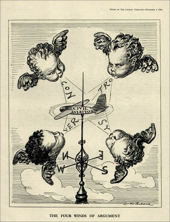 Cartoon by E.H. Shepard – Chicago Convention 1944: THE FOUR WINDS OF ARGUMENT (CON/TRO/VER/SY). Size 27cm x 20.5cm Whole Page. Credit: Punch Magazine (6 December 1944). Political Satire related to WW2 (World War 2) Civil Aviation. See Footnote. Ernest Howard Shepard (1879-1976) was an English artist and book illustrator; He was hired as a regular staff cartoonist by Punch in 1921 and became lead cartoonist in 1945.