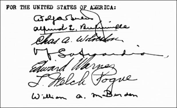 Signatures of the US Delegates on the original Chicago Convention, with those of L. Welch Pogue and Edward Warner, respectively Chairman and Vice Chairman of the Civil Aeronautics Board |