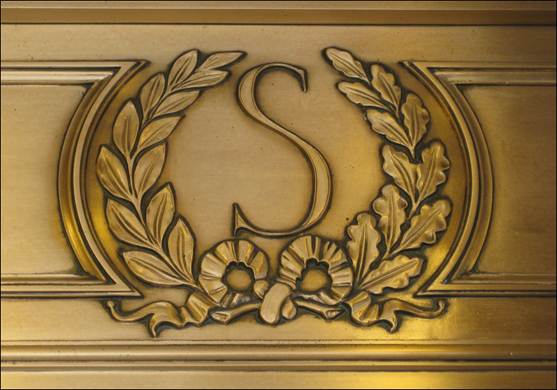Bronze plaque showing the emblem of the Stevens Hotel; it is located above the entrance to the Hotel.
