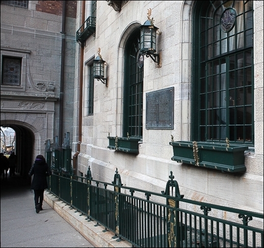 Commemorative bronze plaque installed on the outside wall of the Château Frontenac (Québec City, Canada) remembering that the Château Frontenac was the headquarters of the Armed Forces in August 1943 and September 1944.