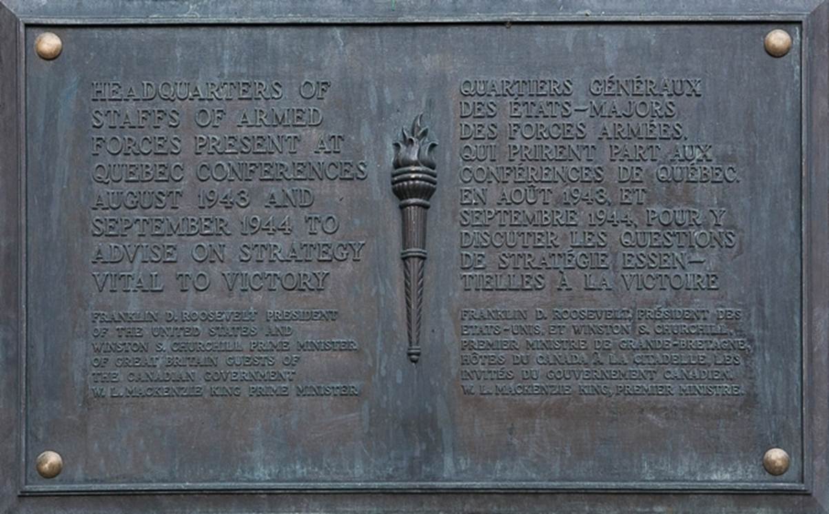 Bronze plaque remembering that the Château Frontenac was the Headquarters of Staff of the Armed Forces present at the Quebec Conferences in August 1943 and September 1944.