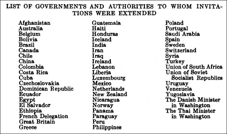 List of the 55 Governments and Authorities to whom the invitation to attend the Chicago Conference was extended. Saudi Arabia and USSR eventually did to attend. Thus, a total of 52 States (including USA) attended the Conference.
