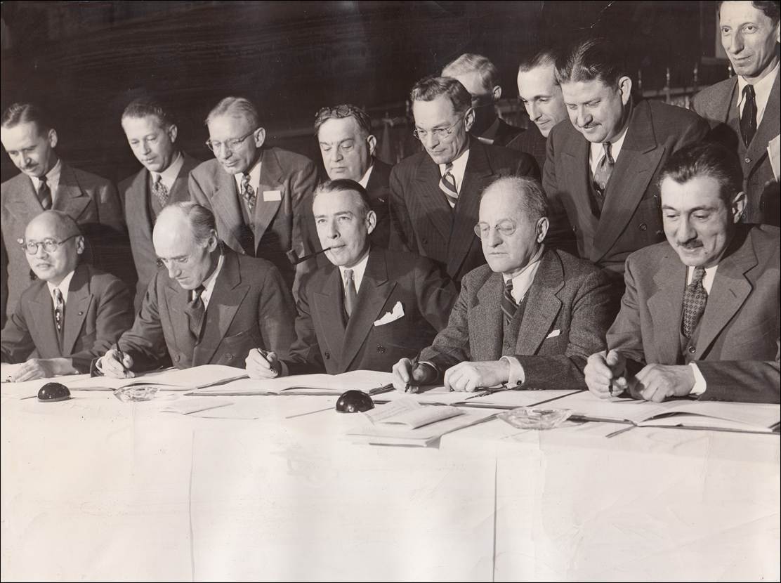 7 December 1944 – Agreements signed at the end of the Chicago Conference in the Grand Ballroom of the Stevens Hotel, Chicago. From left to right: Kia-Ngau, China; Lord Swinton, United Kingdom; Adolf A. Berle Jr., Assistant Secretary of State, the U.S.; H.J. Symington, Canada, and Max Hymans, France.
