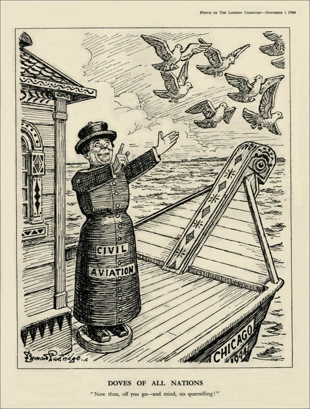 Cartoon by Bernard Partridge. The wooden toy of Civil Aviation releases the doves of peace on its way to Chicago in 1944: DOVES OF ALL NATIONS "Now then, off you go - and mind, no quarrelling!”. Size 27cm x 20.5cm Whole Page. Credit: Punch Magazine (1 December 1944). Political Satire related to WW2 (World War 2) Civil Aviation. See Footnote. Sir John Bernard Partridge (1861-1945) was an English illustrator. In 1891, he joined the staff of Punch and, in 1910, became its chief cartoonist.