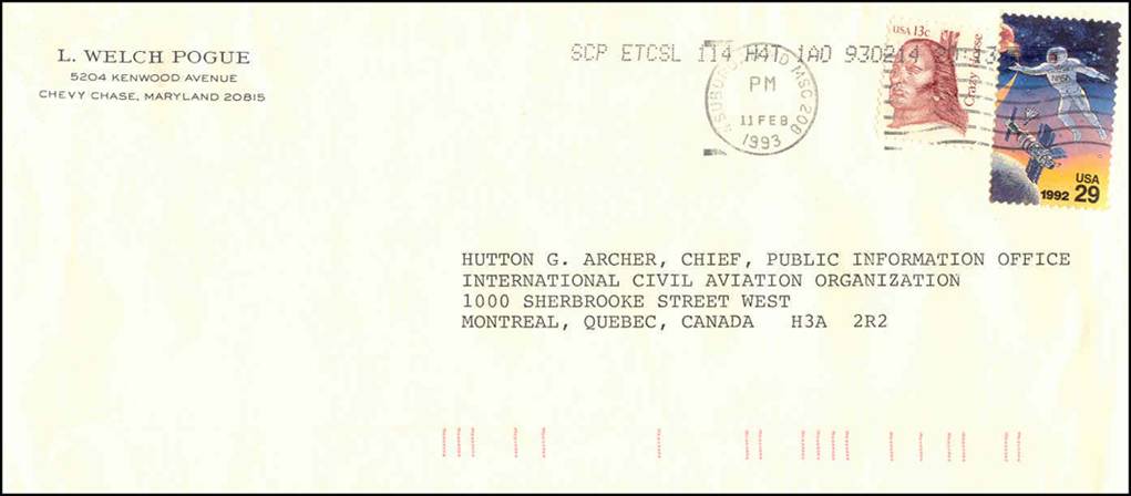 Commercial cover sent by Lloyd Welch Pogue to ICAO Public Information Office (PIO)Postmark dated 11 February 1993 Pioneering aviation attorney, L. Welch Pogue (1899-2003) was Chairman Civil Aeronautics Board in the USA from 1942 to 1946 and member of the US delegation to the Chicago Conference.