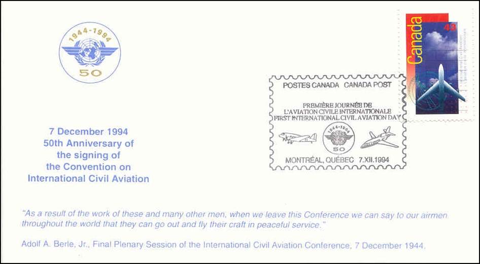 7 December 1994 - 50th Anniversary of ICAO – Commemorative cover The quotation on this cover from Adolf A. Berle, Jr., U.S. Assistant Secretary of State, Chairman of the American Delegation and President of the International Civil Aviation Conference, at the Final Plenary Session, reads as follows: “As a result of the work of these and many other men, when we leave this Conference, we can say to our airmen throughout the world that they can go out and fly their craft in peaceful service.”