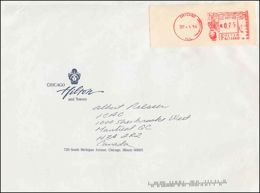 Service cover sent from the Chicago Hilton and Towers Hotel, previously named the Stevens Hotel – Postmark dated 6 September 1996.