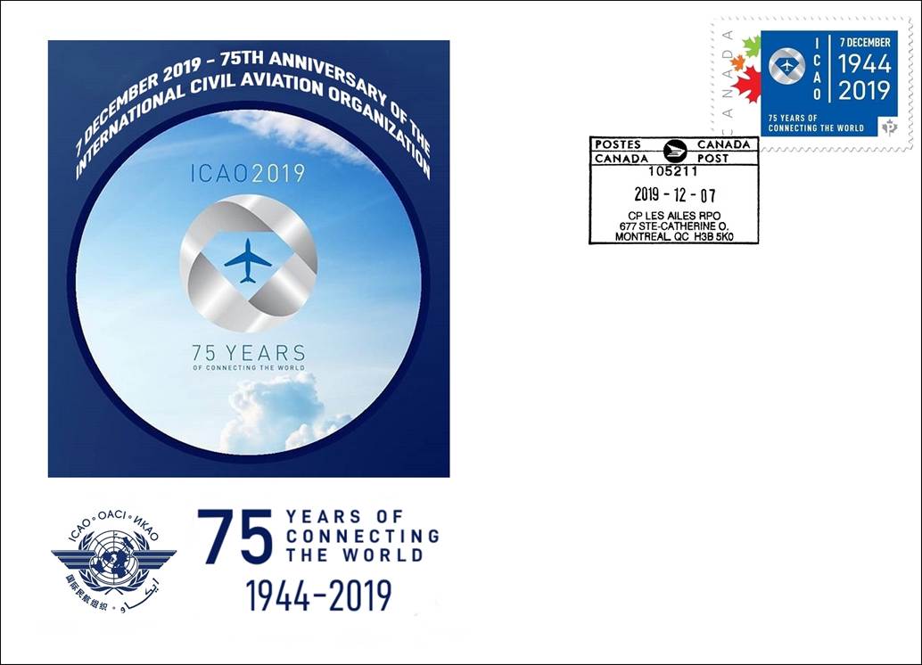 First Day Cover commemorating the 75th Anniversary of the Entry into Force of the Chicago Convention on 4 April 2022. The cachet at left shows a montage of the stamps issued for the 75th anniversary of the Organization commemorated in 2019. See details of these stamps at: Stamps 75th Anniversary.