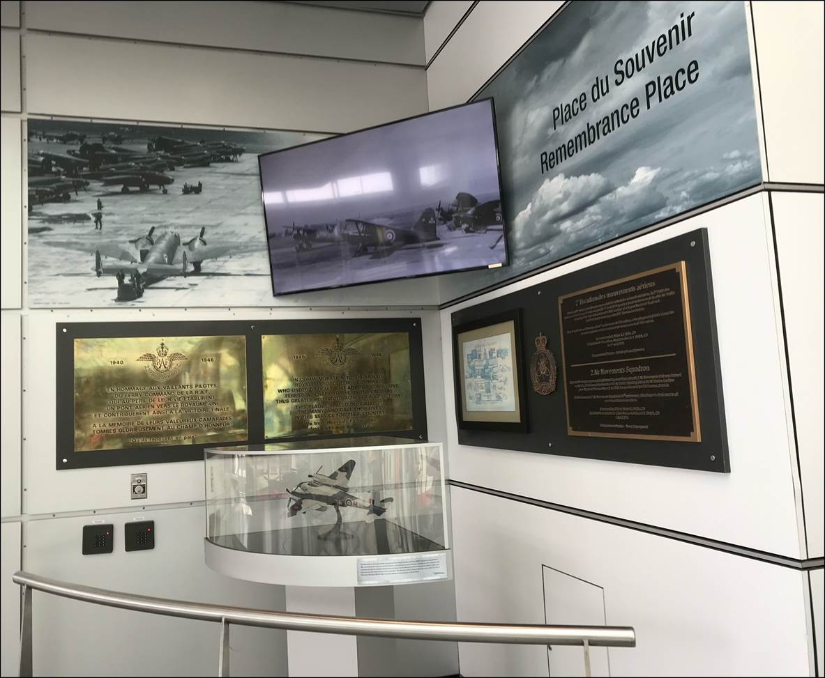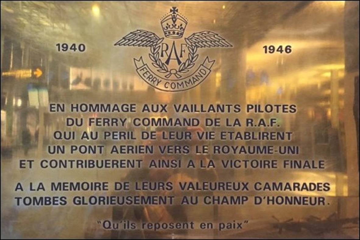 Picture of the Remembrance Place at Montréal-Pierre Elliott Trudeau International Airport, showing the Plaque dedicated to the pilots of the RAF Ferry Command. Detail of the Royal Air Force (RAF) Ferry Command Memorial Plaque (gilt metal) dedicated to the pilots of the RAF Ferry Command. |