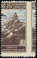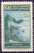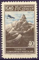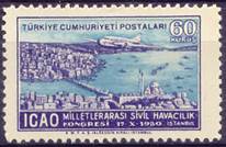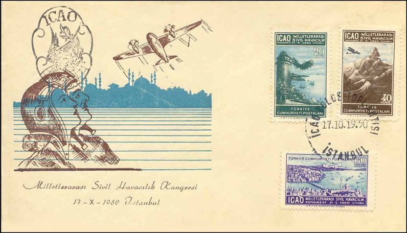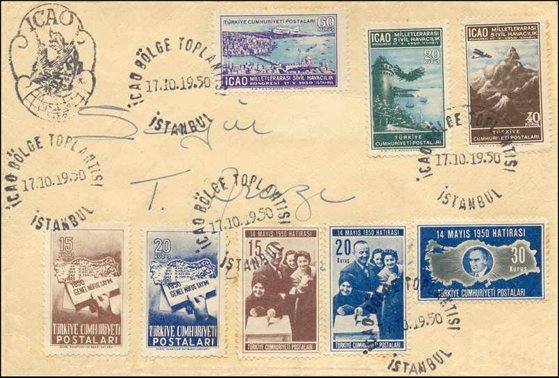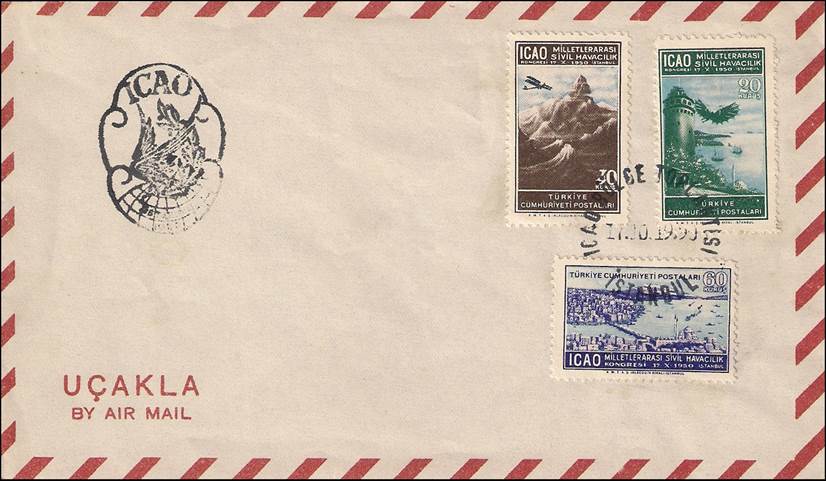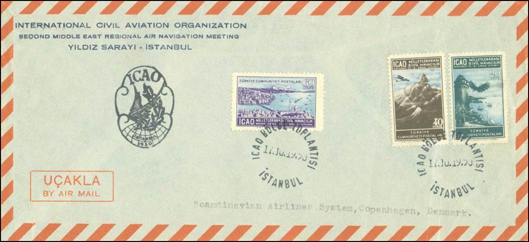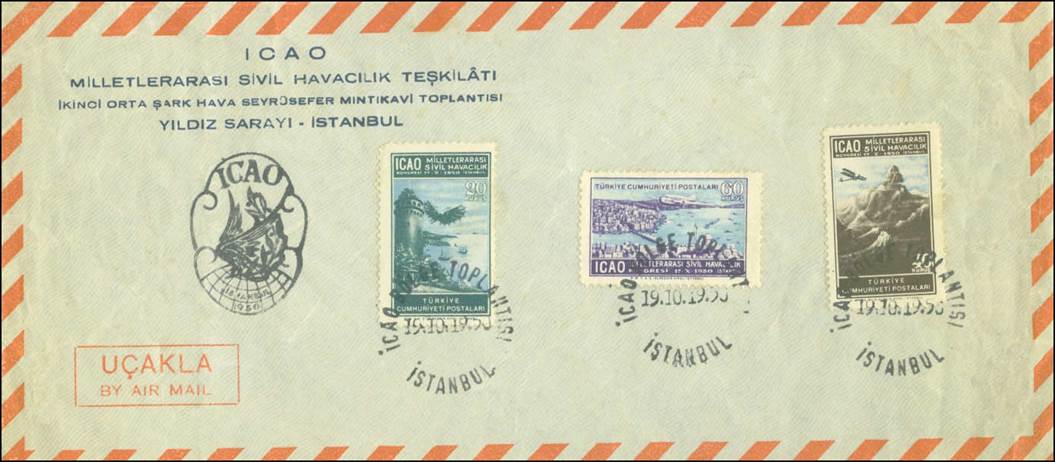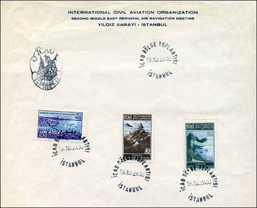 On 17 October 1950, Turkey issued a set of three stamps to commemorate this RAN meeting; these are also the first stamps issued within the ICAO stamp collection, should PICAO’s time be excluded. It is to be noted that many freaks (i.e. misperforations or missing perforations or ink smears) of these stamps can be found. See the stamp issue at the following link: Turkey - Second Middle East Regional Air Navigation Meeting. In the special postmark for this meeting, the Turkish words BÖGLE TOPLANTISI mean REGIONAL MEETING.