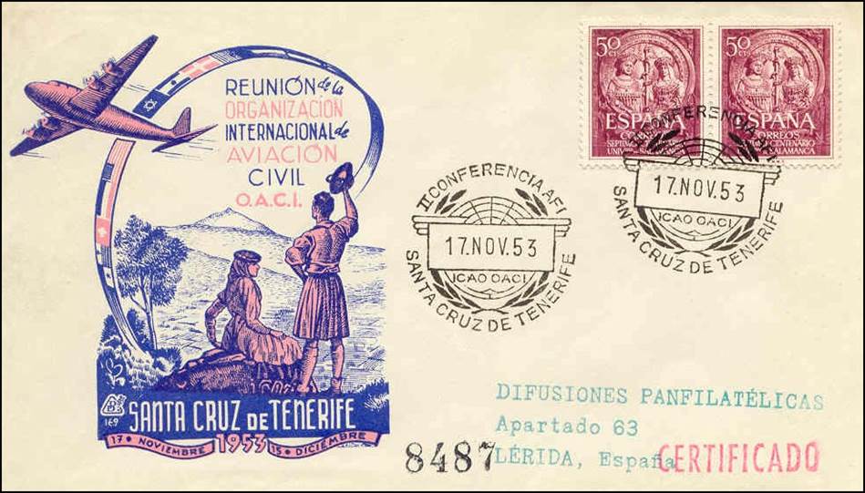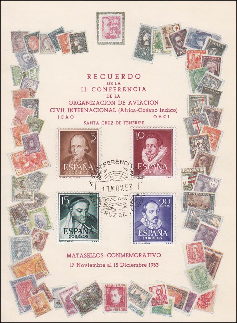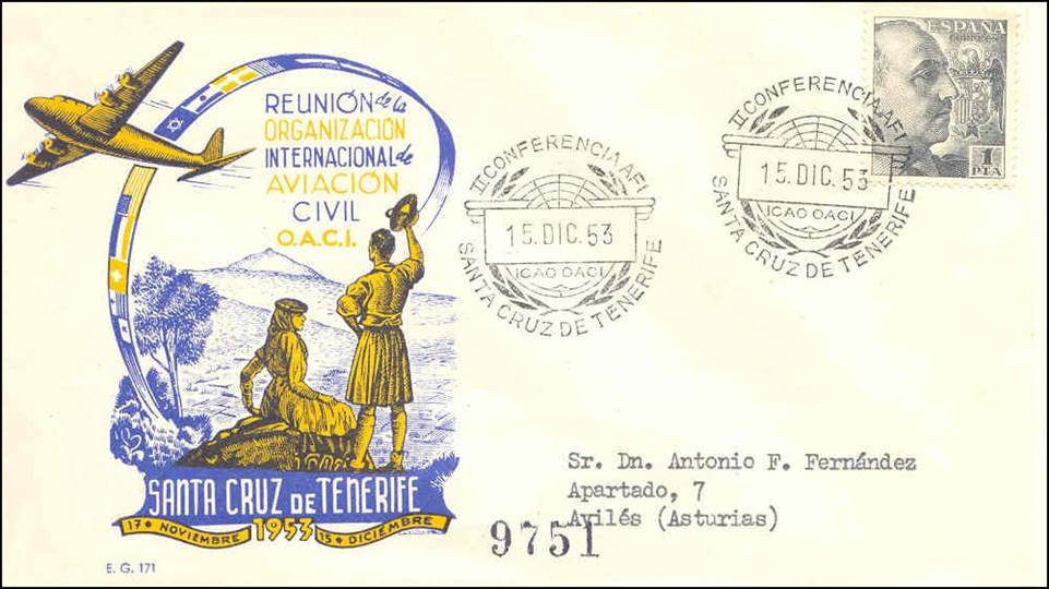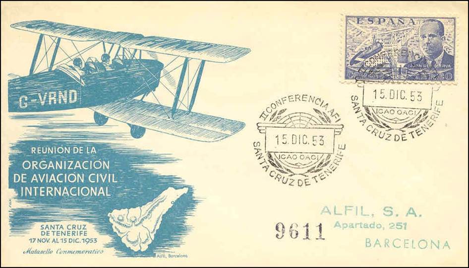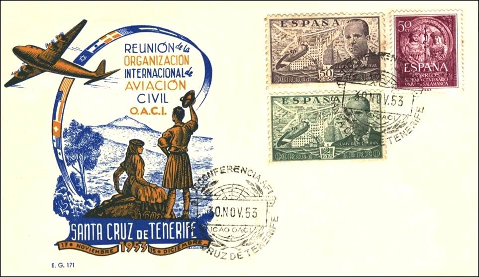 The Second African/Indian (AFI) Regional Air Navigation (RAN) Meeting was held in the Casino Ballroom in Santa Cruz de Tenerife, Canary Islands, Spain from 17 November to 15 December 1953. Many nice first day covers were issued for the commemoration of this meeting.