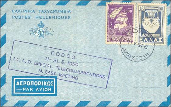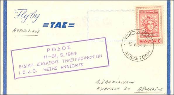 Boxed commemorative hand-stamp with text in Greek: "ΡΟΔΟΣ 11-31.5.1954 - ΕΙΔΙΚΗ ΔΙΑΣΚΕΨΙΗ ΤΗΛΕΠΙΚΟΙΝΩΝΙΩΝ - I.C.A.O. ΜΕΣΗΣ ΑΝΑΤΟΛΗΣ".