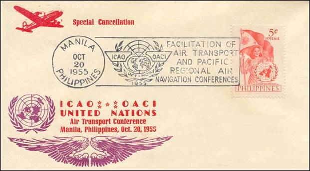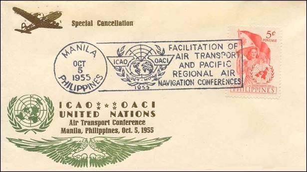 First Day Cover with cancel date: 5 October 1955 (before the actual opening of the Facilitation meeting). The cachet refers to the Facilitation of Air Transport meeting, although the slogan refers to both meetings.