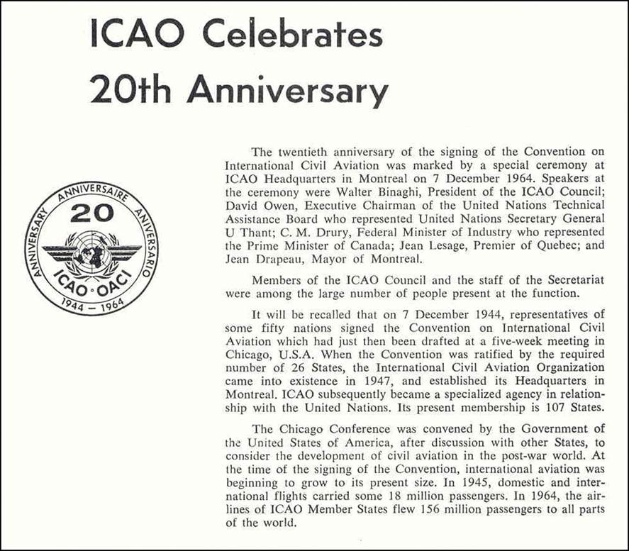 The 20th anniversary of the International Civil Aviation Organization (ICAO) was celebrated on 7 December 1964, corresponding to the anniversary of the signing of the Convention on International Civil aviation, in Chicago.