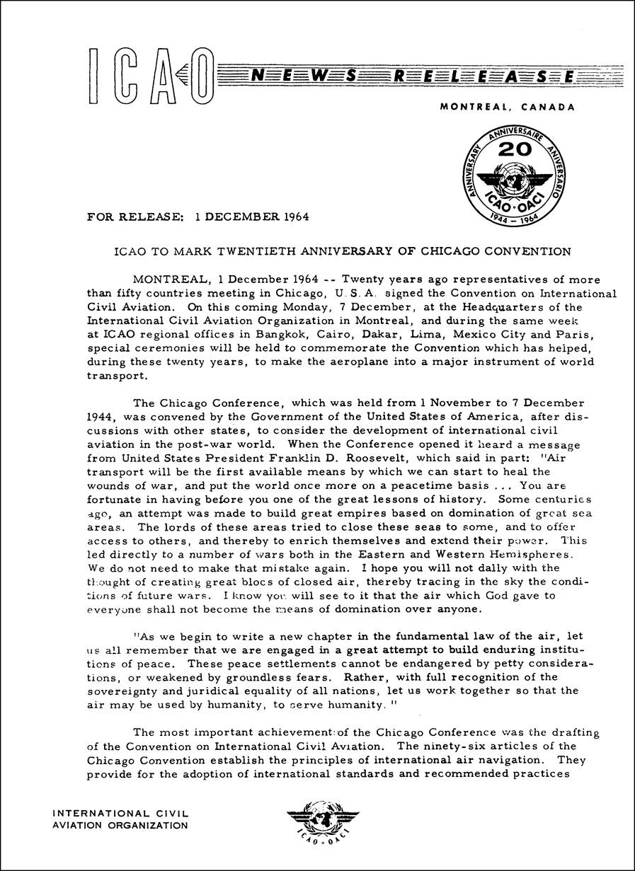 News Release announcing the commemoration of ICAO’s 20th anniversary on 7 December 1964. |