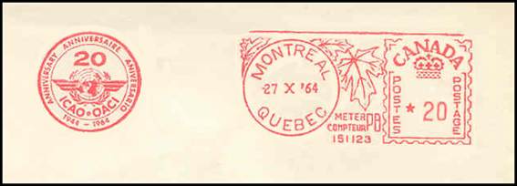 Meter stamp slogan – 27 October 1964 20th anniversary of ICAO. Used at ICAO Headquarters between 27 October 1964 and 7 July 1965. |