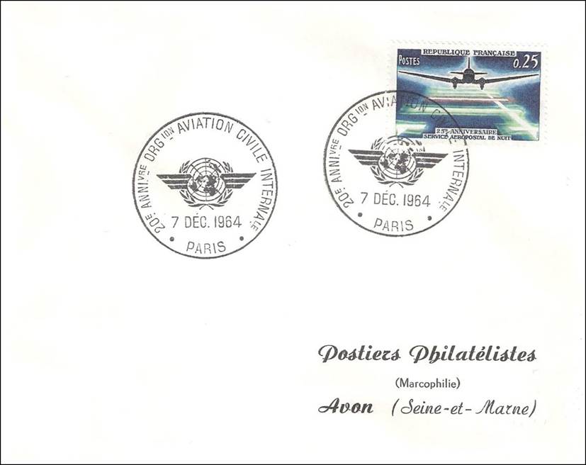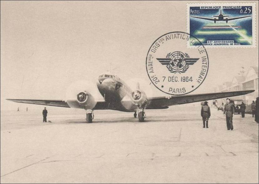 France – 7 December 1964 20th anniversary of ICAO Stamp issued on 9 May 1964 for the 25th anniversary of the first night airmail service. Douglas DC-3 aircraft as shown on the stamp and the maximum card. |