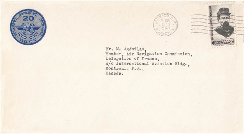 Cover sent to a Member of the Air Navigation Commission (ANC) at ICAO Postmark of Mexico City dated 7 December 1964 Sticker commemorating the 20th anniversary of ICAO |