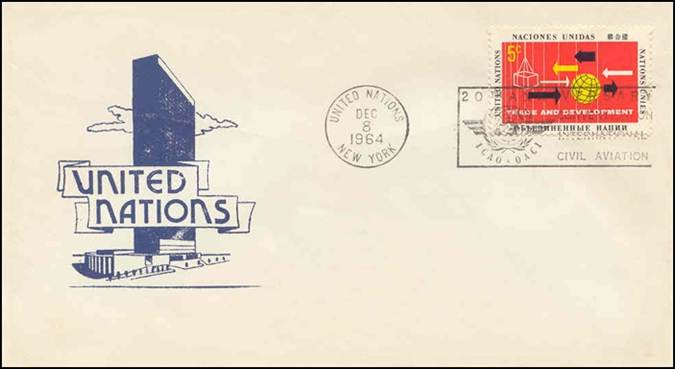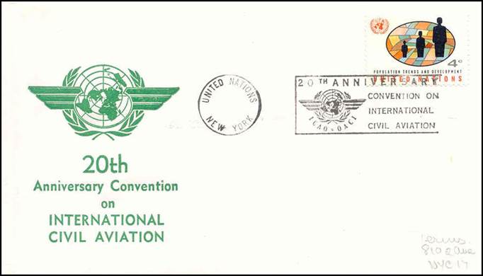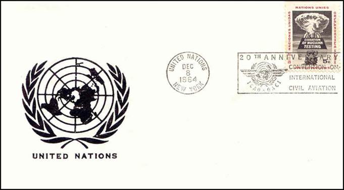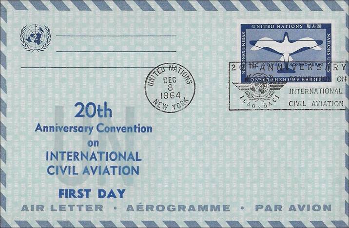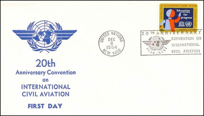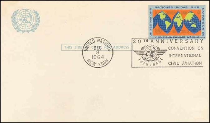 United Nations – 8 December 1964 20th anniversary of ICAO Cancel with slogan; stamps issued on 9 February 1955 for the 10th anniversary of ICAO |