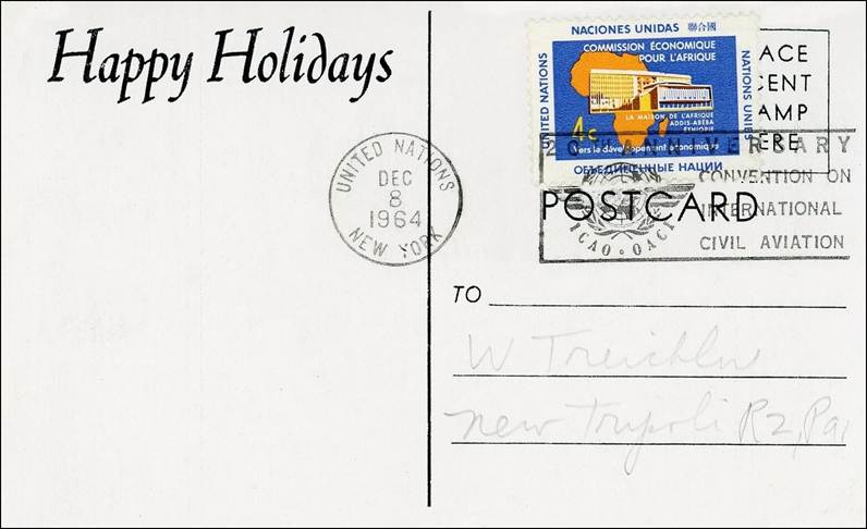 United Nations - Happy Holidays card (Recto and Verso) - 8 December 1964 20th anniversary of ICAO Cancel with slogan
