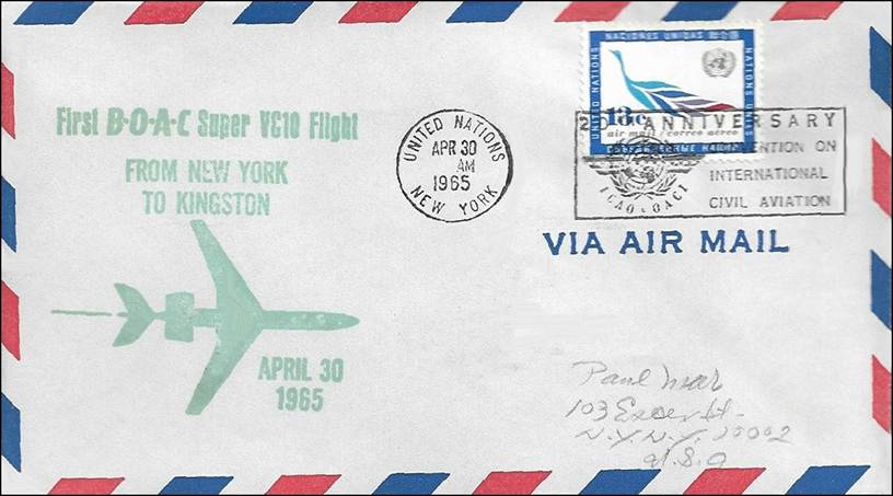 30 April 1965 First flight of the BOAC Vickers Super VC10 from New York to Kingston. Note that Vickers-Amstrong’s Ltd. VC10 entered service in April 1965. Many first flight covers related to this aircraft used the 13-c airmail stamp Bird of Laurel Leaves (Laurel branch in the form of a bird) issued by the United Nations on 17 June 1963 with the cancel commemorating the 20th anniversary of ICAO. |