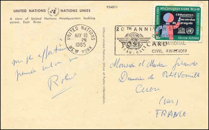 United Nations – 10 May 1965 20th anniversary of ICAO Cancel with slogan Postcard |