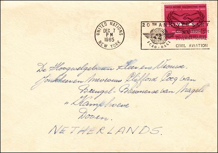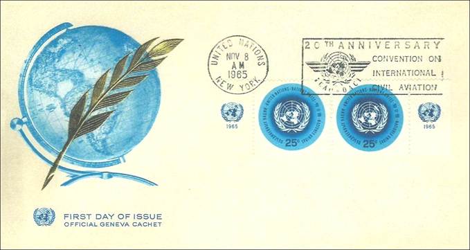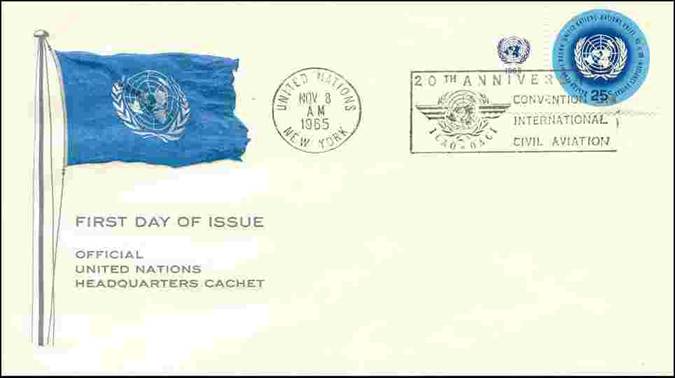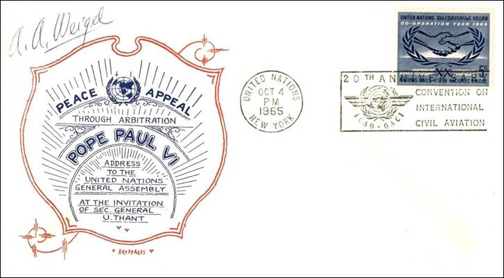 United Nations 20th anniversary of ICAO On 4 October 1965, His Holiness Pope Paul VI addressed a plenary meeting of the twentieth session of the United Nations General Assembly Artopages cachet A.A. Weigel autographed cachet (See footnote 1)