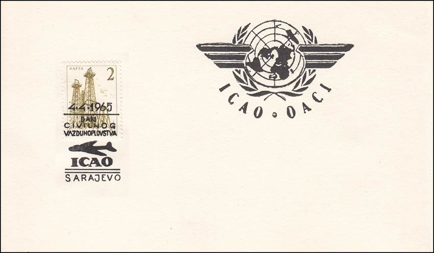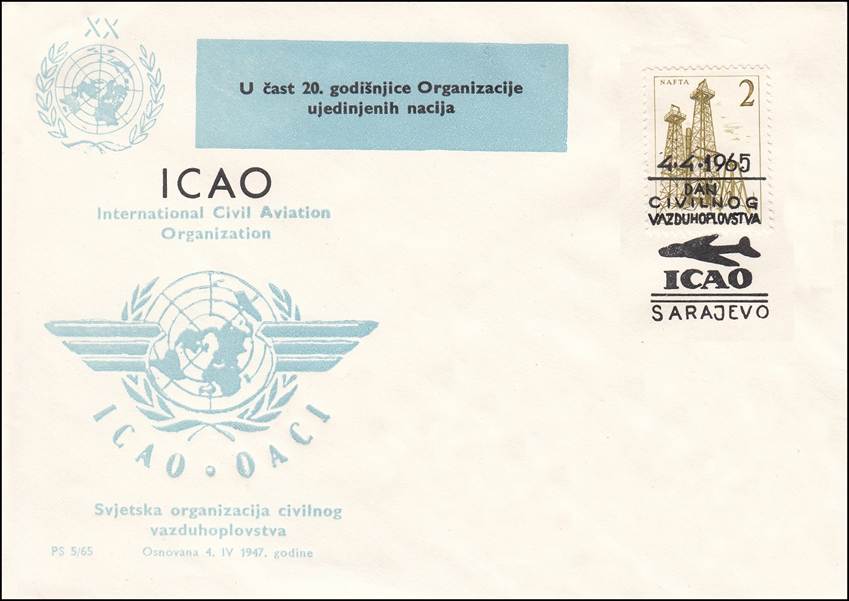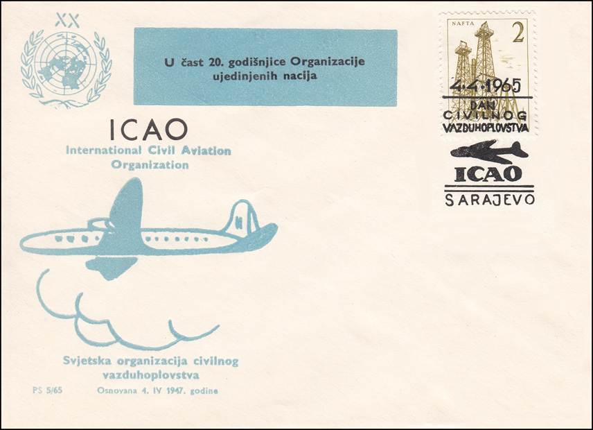 The covers commemorate several events, with an actual mismatch in anniversaries. All texts are in Serbo-Croatian official language. In the blue upper square: “Celebration of 20 years of the United Nations Organization”, with the UN emblem and figures XX. On 24 October 1945, the United Nations (UN) came into force when the five permanent members of the Security Council ratified the charter that had been drawn up earlier that year. At the lower-left: “International Civil Aviation Organization” on 2 lines, followed by: “Established on 4. IV. 1947”. The cancel indicates: 4-4-1965, followed by: “Day of civil aviation” (DAN CIVILNOG VAZDUHOPLOVSTVA), on 3 lines. The actual work of the Organization started in 1945, when the Interim Agreement was accepted by the 26th State on 6 June 1945; thus, the Provisional International Civil Aviation Organization (PICAO) was born on that date. The Convention on International Civil Aviation (i.e., the Chicago Convention) came into effect on 4 April 1947 (30 days after the 26th State had ratified this Convention) with the constitution of the new permanent ICAO, thus bringing an end to PICAO.