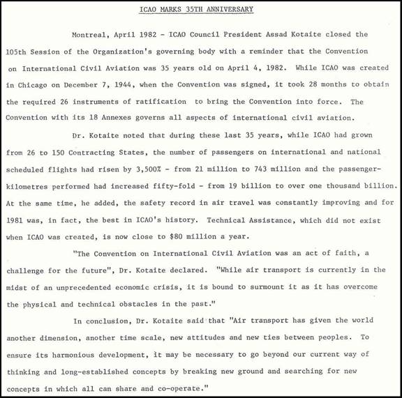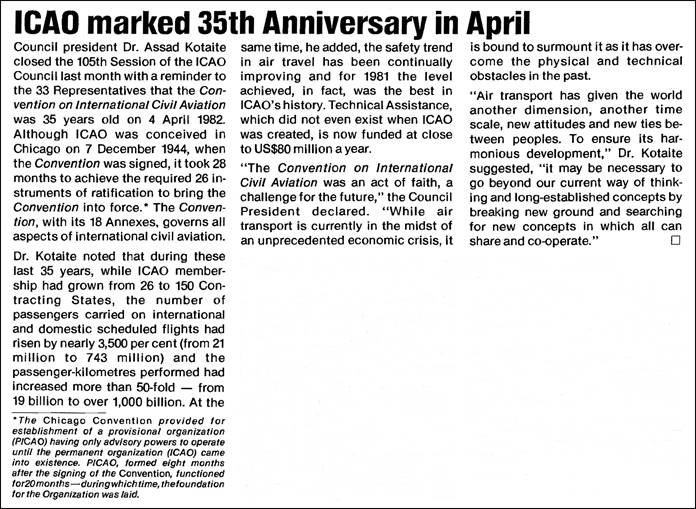 The International Civil Aviation Organization (ICAO) celebrated its 35th anniversary on 4 April 1982, as the Organization officially came into being on 4 April 1947 following ratification by 26 States of the Convention on International Civil Aviation, known as the Chicago Convention, which is the Charter of the Organization. ICAO’s Public Information Office (PIO) issued a News Release as shown hereafter.