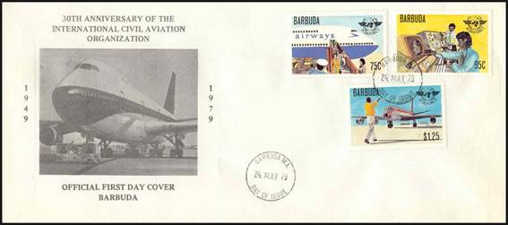 Barbuda – 25 May 1979 This cover seems to commemorate the 30th anniversary of ICAO; the year 1949 does not correspond to any major reference date (such as 1944, 1945 or 1947) from which ICAO anniversaries could be (and were sometimes) counted. It should have more rightly commemorated the 35th anniversary (1944-1979). |