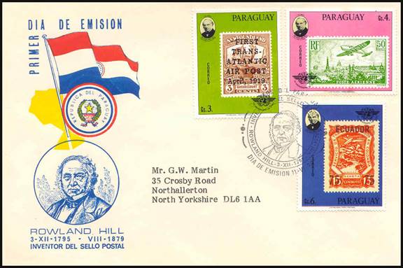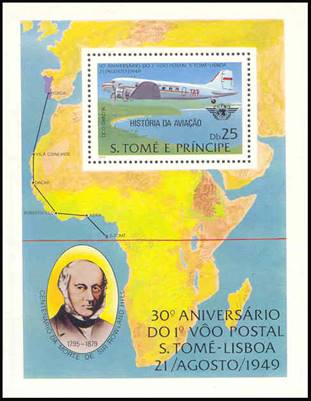 Sao Tome and Principe 28 December 1979 This souvenir sheet commemorates three events: the 100th anniversary of Sir Rowland Hill’s death (1795‑1879), the 35th anniversary of ICAO, and the 30th anniversary of first airmail flight St. Thomas-Lisbon (21 August 1949)