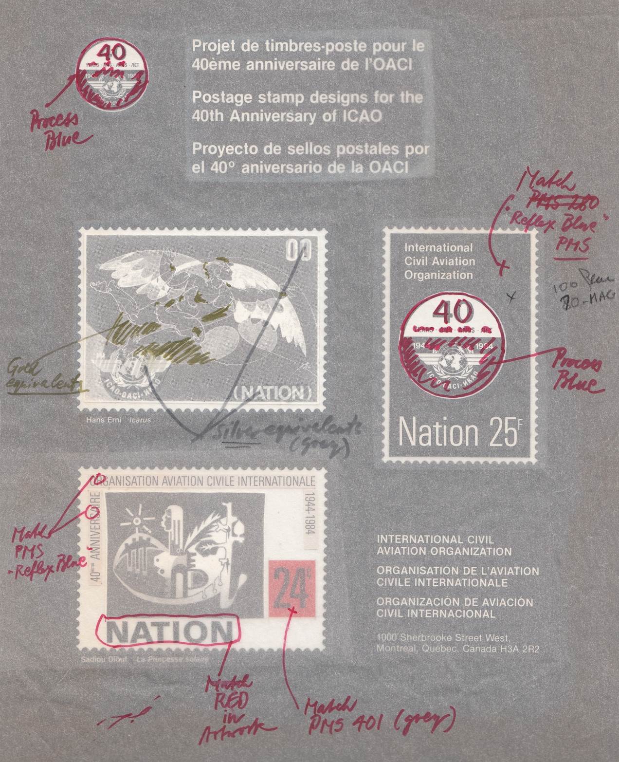 Since its fortieth anniversary, the International Civil Aviation Organization (ICAO) had decided to use the ending date of the Chicago Conference, i.e., 7 December 1944, to calculate its anniversaries. In the following correspondence sent to all ICAO Contracting States (State Letter O 1/6.4 – 82/108, dated 4 August 1982), the ICAO Secretary General, Yves Lambert, suggested to the Civil Aviation Authorities to consider the issuance of postage stamps to commemorate the 40th anniversary of the signing in Chicago of the Convention on International Civil Aviation (i.e., 7 December 1984). The attachment to the State Letter proposed three postage stamp designs.