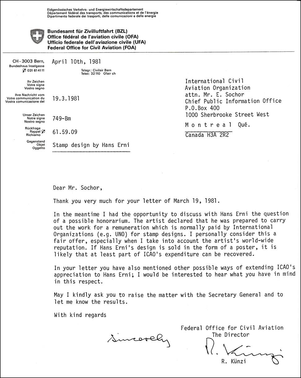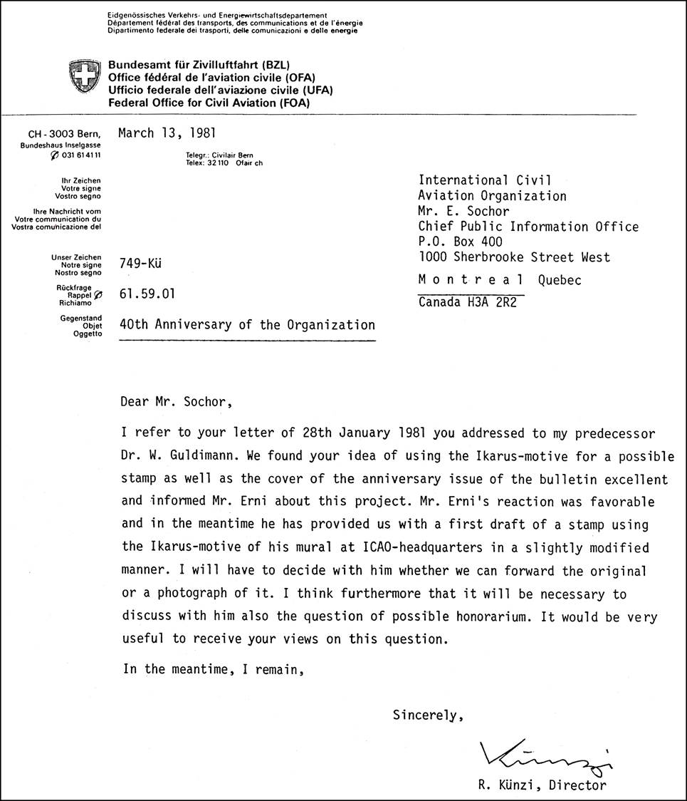 It is to be noted that the picture of Icarus as shown in the mural was slightly modified by Hans Erni for its use on the stamps for the 40th anniversary. See here-below the exchange of correspondence.