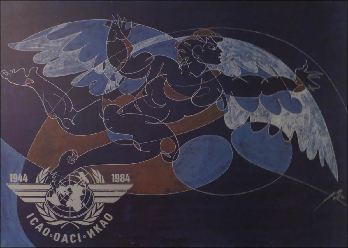 Within the framework of the above project for stamps to commemorate the 40th anniversary of ICAO, two designs refer to artwork exhibited in the ICAO premises, i.e., the Man in Flight mural by Hans Erni and the Solar Princess tapestry by Saliou Diouf. As it is the case for other buildings of the United Nations, the ICAO building houses a remarkable collection of art and artefacts, donated or loaned by its Contracting States, international organizations, companies or individuals, which include ceramics, furnishings, mosaics, murals, paintings, sculptures, tapestries, etc. While the gifts of art works at the United Nations are in harmony with the environment of peacekeeping, most of the gifts to ICAO exemplify its goals for civil aviation. The decor of the ICAO building, currently located at 999 Boulevard Robert-Bourassa in Montréal, was an early concern to promote the best placement of the art works available when the Organization moved from its prior headquarters located at 1000 Sherbrooke West.