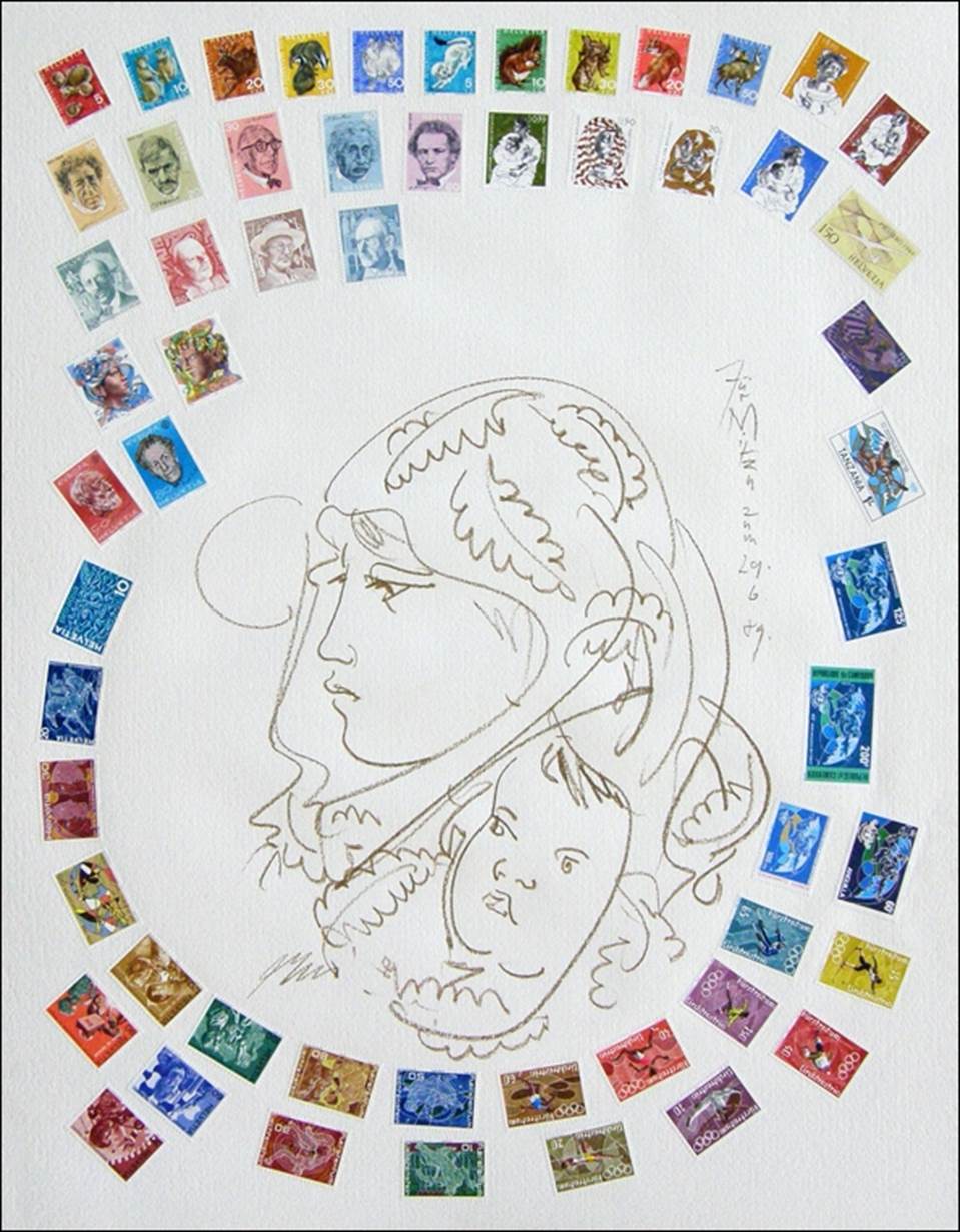Stamp collage with pencil drawing (unique) showing various stamps designed by Hans Erni. Approx. 51.5 x 40.5 cm; dated 29.6.89, signed Erni. The ICAO stamps related to the 40th anniversary are shown on the right side. Participating countries were (from top to bottom): Tanzania, Gabon, Cameroon, Anguilla and Turkey. Note that the stamp from Uruguay and the miniature sheet from Togo are not depicted.