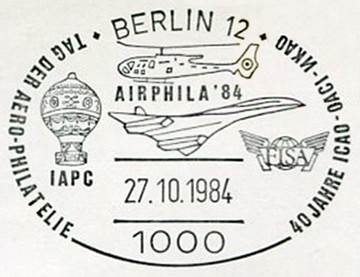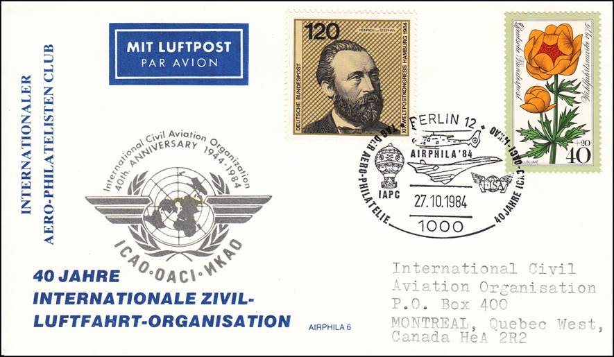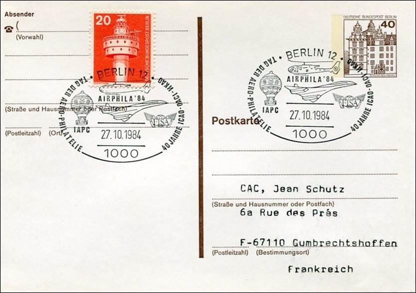 Germany - 40th Anniversary of ICAO. Postcard. Aero-philatelic day, Berlin: 27 October 1984 (AIRPHILA 84).
