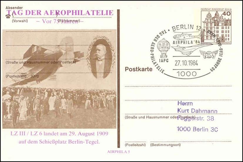 Germany - 40th Anniversary of ICAO. Postcard. Aero-philatelic day, Berlin: 27 October 1984 (AIRPHILA 84). Berlin - First visit of the Zeppelin LZ6 airship in Tegel. Welcoming committee for Ferdinand Graf von Zeppelin. In 1909, Count Zeppelin achieved a long-held ambition of flying from Lake Constance to Berlin. On board as passengers on the voyage, which started on 27 August, were the Crown Prince of Germany and the King of Würtemberg. After a trip of two days broken by overnight stops, the LZ-6 airship (confusingly also named Zeppelin III or LZ III) arrived on 29 August 1909 in Berlin-Tegel to be greeted by the German Empress and many crowd (see cachet of the above postcard, marking the 75th anniversary of this landing). In 1909, the LZ-6 became the first Zeppelin to be used for the transport of passengers.
