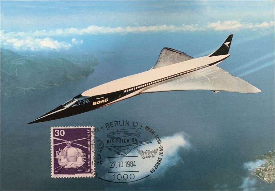 Germany - 40th Anniversary of ICAO. Postcard (recto and verso). Aero-philatelic day, Berlin: 27 October 1984 (AIRPHILA 84). Supersonic Concorde. This airliner was designed jointly by Sud-Aviation (later Aérospatiale, then Airbus) and the British Aircraft Corporation (later British Aerospace). It was operated between 1976 and 2003 by Air France and British Airways. Commercial flights began on 21 January 1976 and ended twenty-seven years later, between May and October 2003. Concorde's high fuel consumption had made it loss-making. Its decline was precipitated by the accident of Air France flight 4590 on 25 July 2000, the only major accident involving a Concorde, which resulted in the deaths of 113 people. It was a major driver of European technological and strategic development, and also had a strong cultural impact. Along with the Russian Tupolev Tu-144 (which carried passengers for only a few months), it was the only supersonic passenger aircraft to operate for any significant length of time.